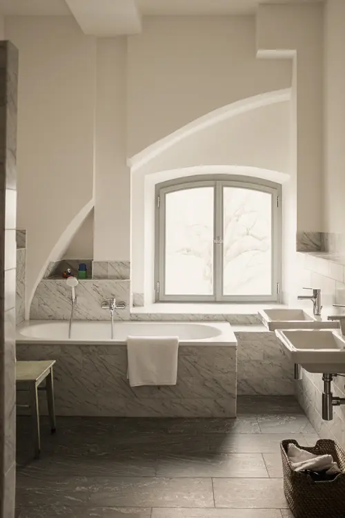 Just thinking of the surroundings is enough to make you feel at peace, but inside the manor, you’re treated to modern, bright apartments, with simple furnishings and hand-picked antiques, old books and little peculiarities. Each is spacious, and comes complete with a sleek kitchen and spoiling marble bathtub. It’s hard to believe that, just a few years ago, the building was a total ruin. But perhaps better still is that each apartment has its own view of the ground and water; the manor is, in fact, at the heart of the shallow seawater bay that is the “Üselitzer Wiek”.